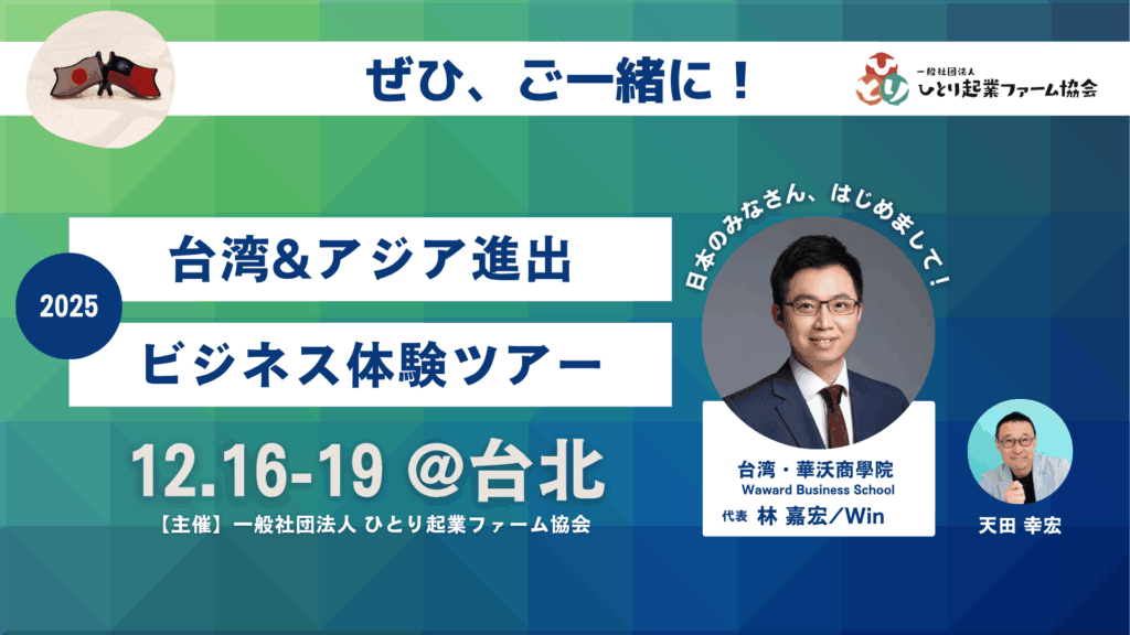 一般社団法人ひとり起業ファーム協会は、2023年にスタートした台湾との起業家交流事業におきまして、2025年12月に台湾&アジア進出を視野に入れる経営者を対象にビジネス体験ツアーを実施します。年に一度開催されるこの機会をご利用ください。